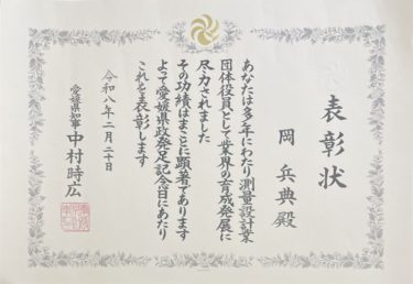 このたび、当社代表取締役 岡兵典社長が、長年にわたり地域社会へ貢献するとともに、測量設計業団体役員として業界の育成発展に尽力してきた功績が高く評価され、愛媛県知事表彰を受賞いたしました。
