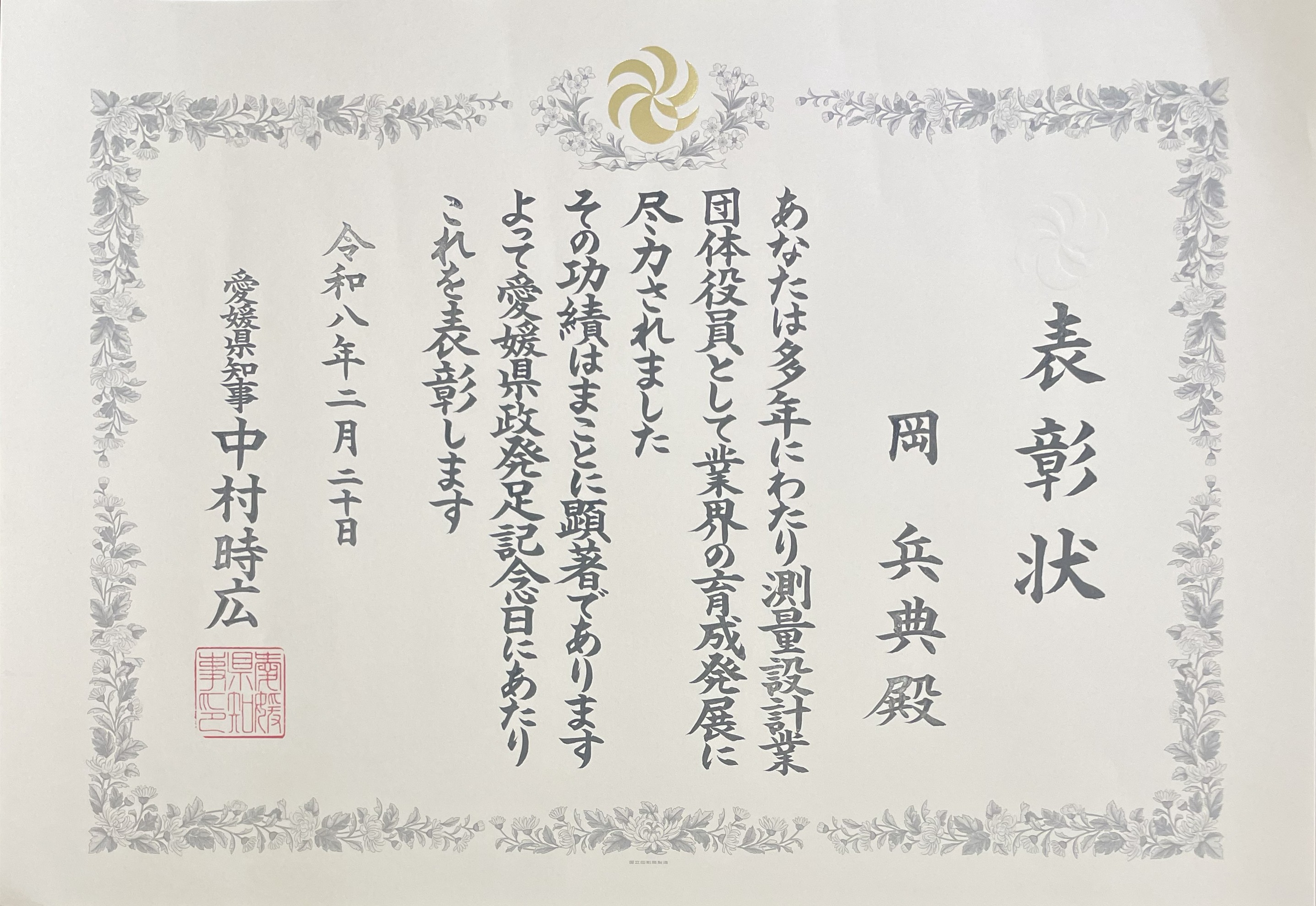 このたび、当社代表取締役 岡兵典社長が、長年にわたり地域社会へ貢献するとともに、測量設計業団体役員として業界の育成発展に尽力してきた功績が高く評価され、愛媛県知事表彰を受賞いたしました。
